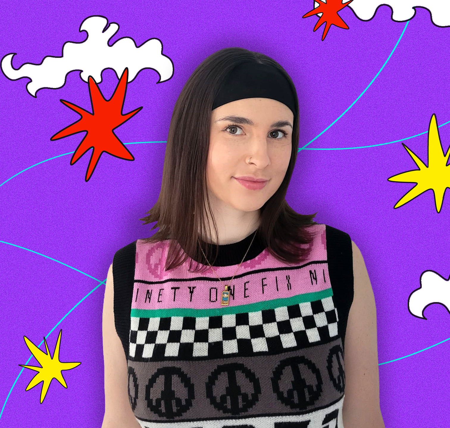 Her work blends bold colour, dreamy atmospheres, and nostalgic references drawn from pop culture, 80s aesthetics, and playful fashion.
